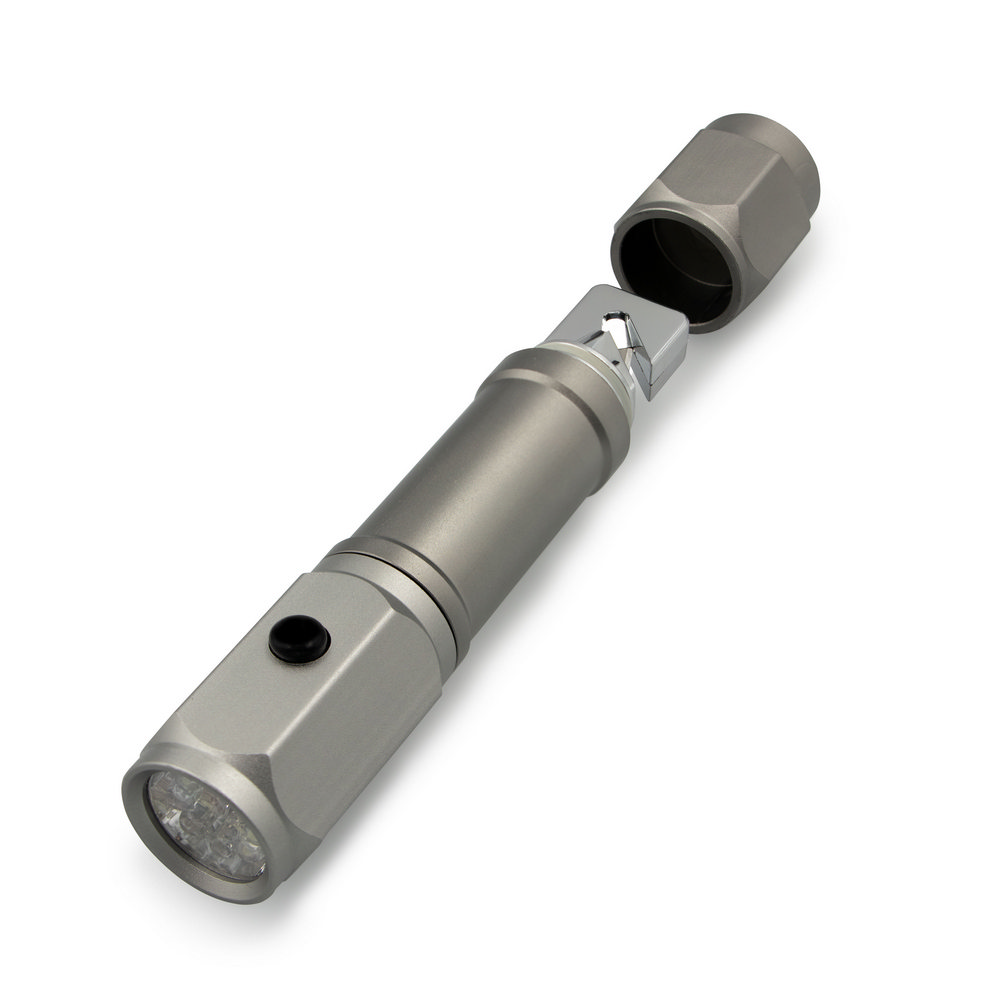 Die Notfalltaschenlampe ist der ideale Imageträger für Ihr Unternehmen! Mit einem kompakten Design (Ø3,3 x 15,5 cm) und einem robusten Aluminium-Gehäuse ist sie nicht nur funktional, sondern auch langlebig. Diese innovative Lampe liefert beeindruckende 60 Lumen Licht, bietet mit einem Sicherheitshammer und einem Sicherheitsmesser echten Mehrwert und erleichtert den Alltag Ihrer Kunden.